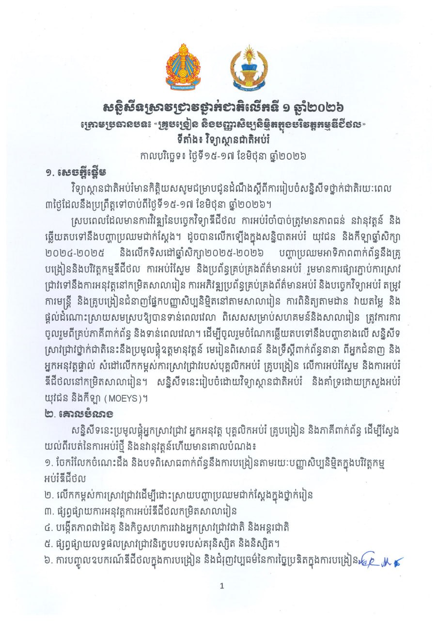 សូមគោរពផ្ញើជូនសេចក្តីជូនដំណឹងសន្និសីទស្រាវជ្រាវអប់រំលើកទី១ ឆ្នាំ២០២៦ នៅវិទ្យាស្ថានជាតិអប់រំ ក្រោមប្រធានបទ៖ គ្រូបង្រៀន និងបញ្ញាសប្បនិម្មិតក្នុងបរិវត្តកម្មឌីជីថល នៅវិទ្យាស្ថានជាតិអប់រំ ចាប់ពីថ្ងៃទី ១៥-១៧ ខែមិថុនា ឆ្នាំ២០២៦ ។ សូមអរគុណ